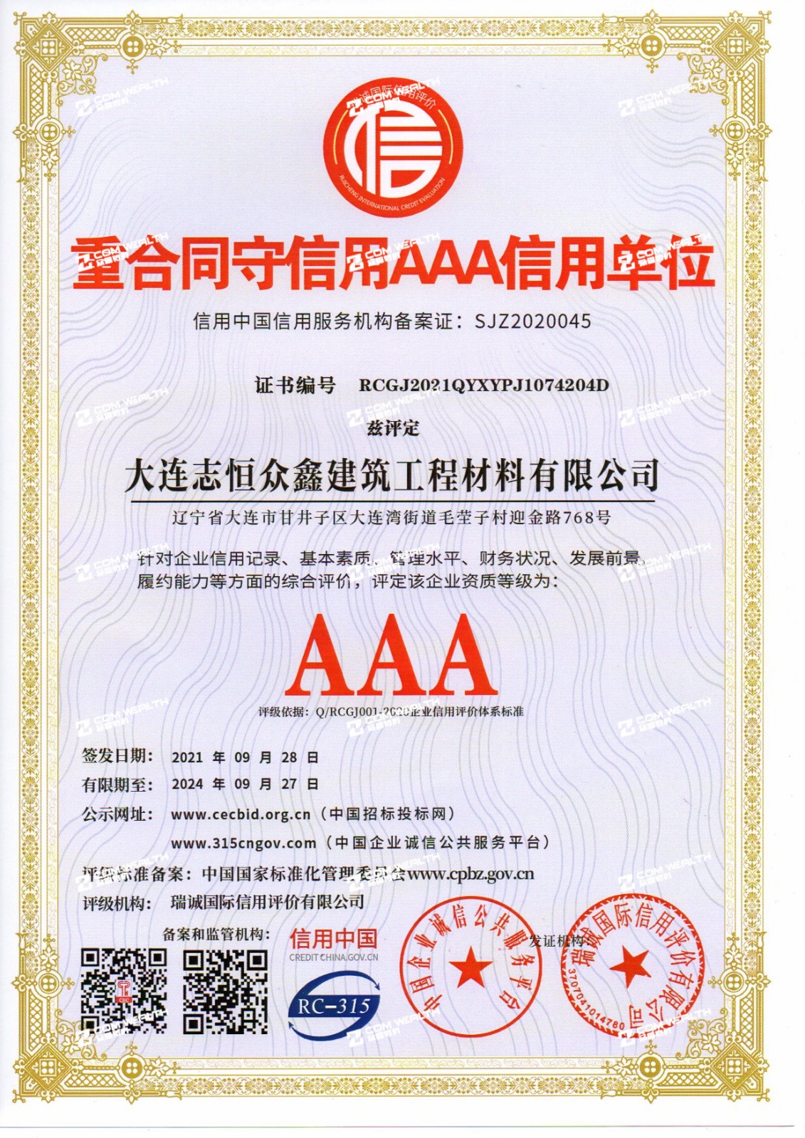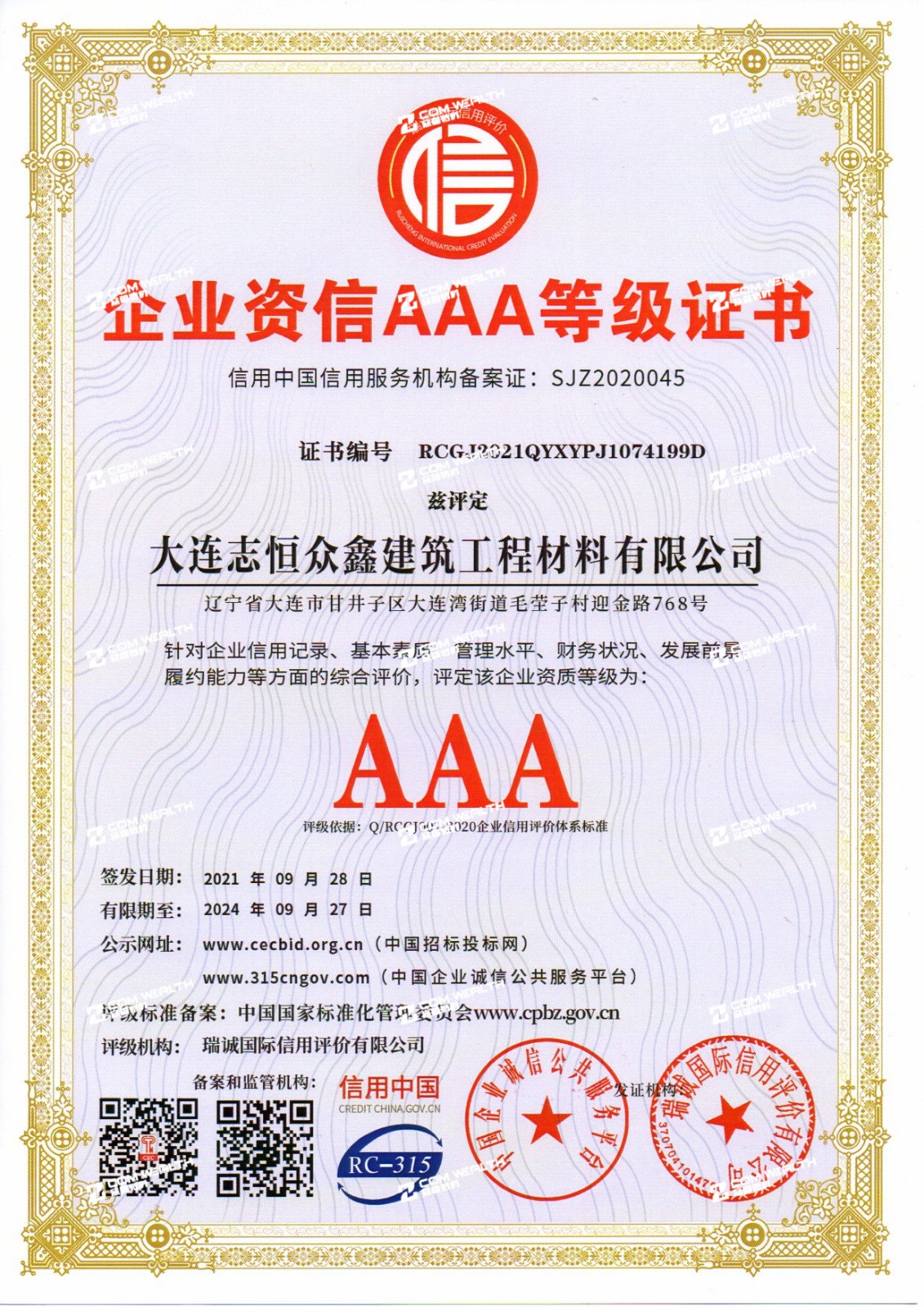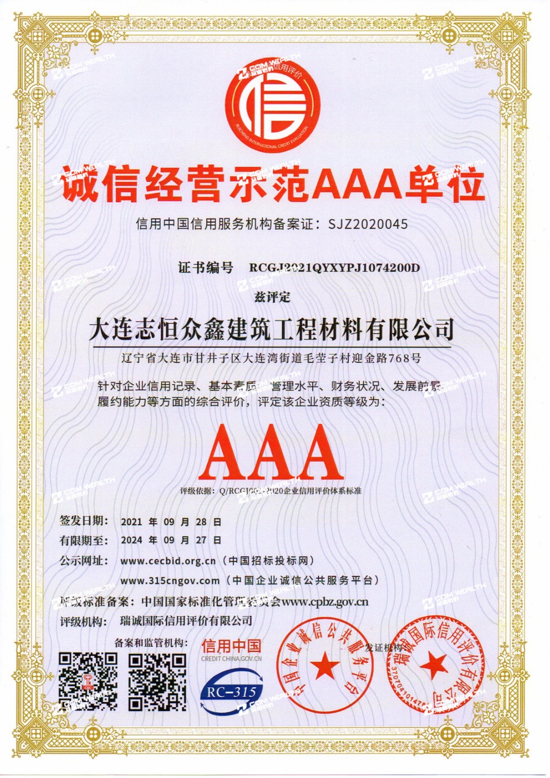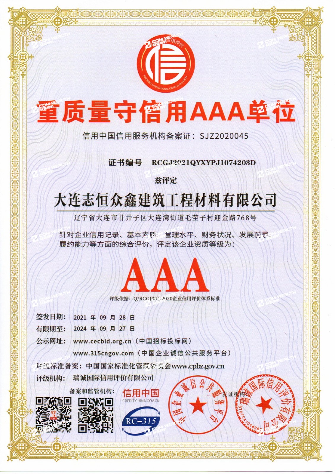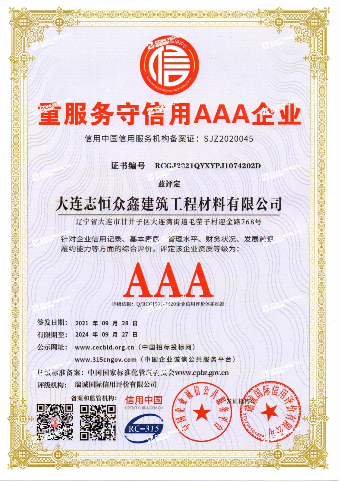 企業資信AAA等級證書