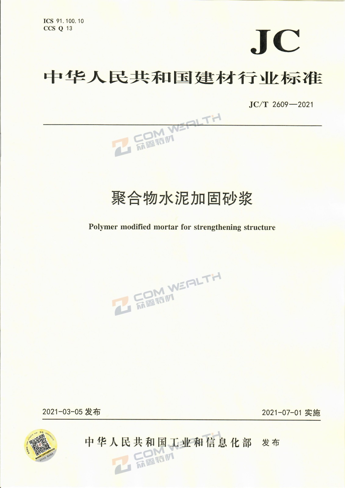 參編JC/T 2609-2021 《 聚合物水泥加固砂漿》建材行業標準